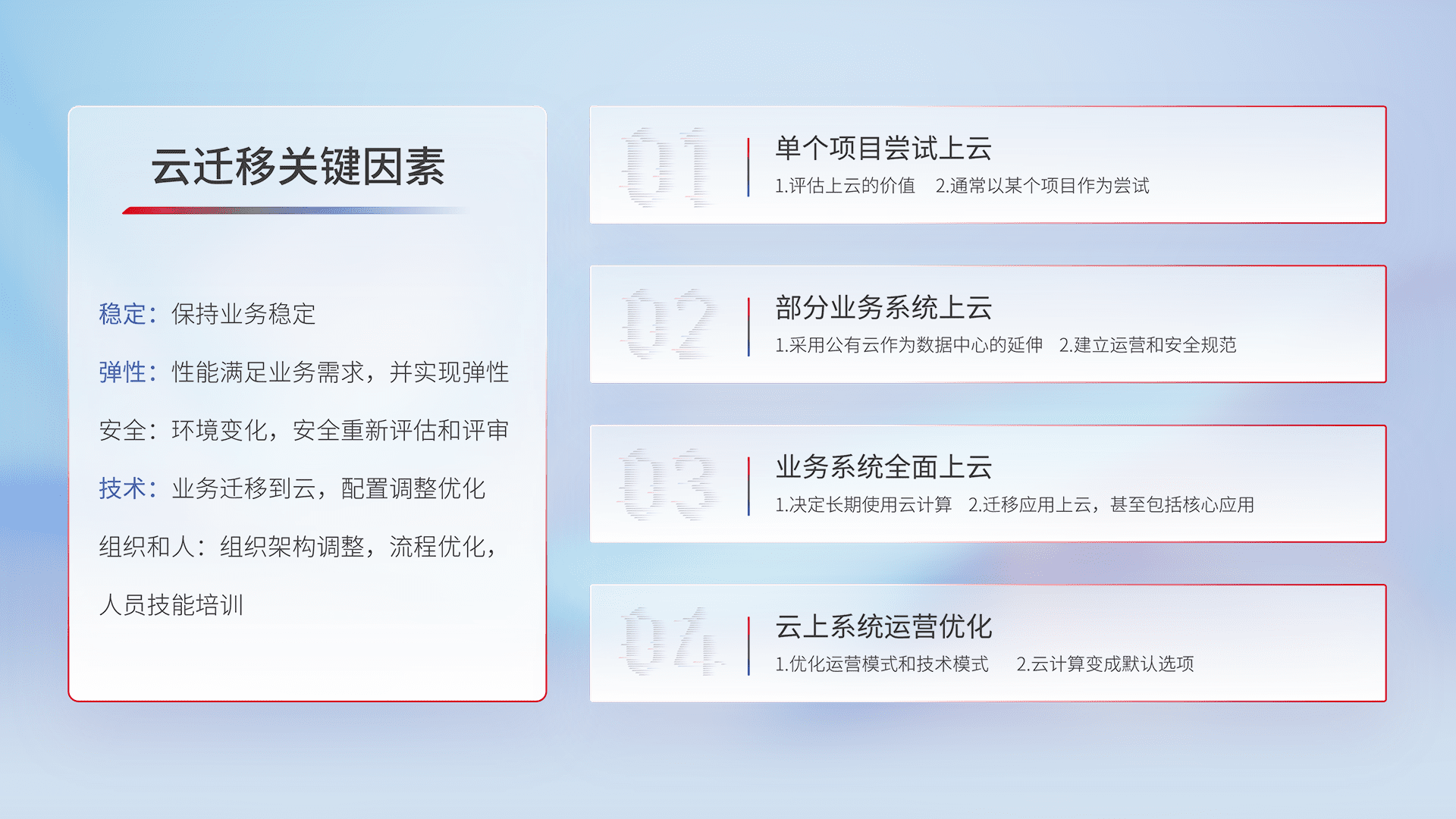 结合实际业务,,,,从规划设计、、、、云平台选型、、、、云原生改造、、、、数据迁移、、、集成交付,,迁移全过程为客户识别最佳上云路径,,,,做好风险识别管理,,,设计网络架构、、、、身份权限、、、、安全审计合规、、操作审计、、日志审计、、监控告警策略、、、多站点容灾设计等,,对云上基础设施进行整体规划,,,提升IT治理水平,,,,以满足弹性、、、、高可用、、、高性能的需求。。